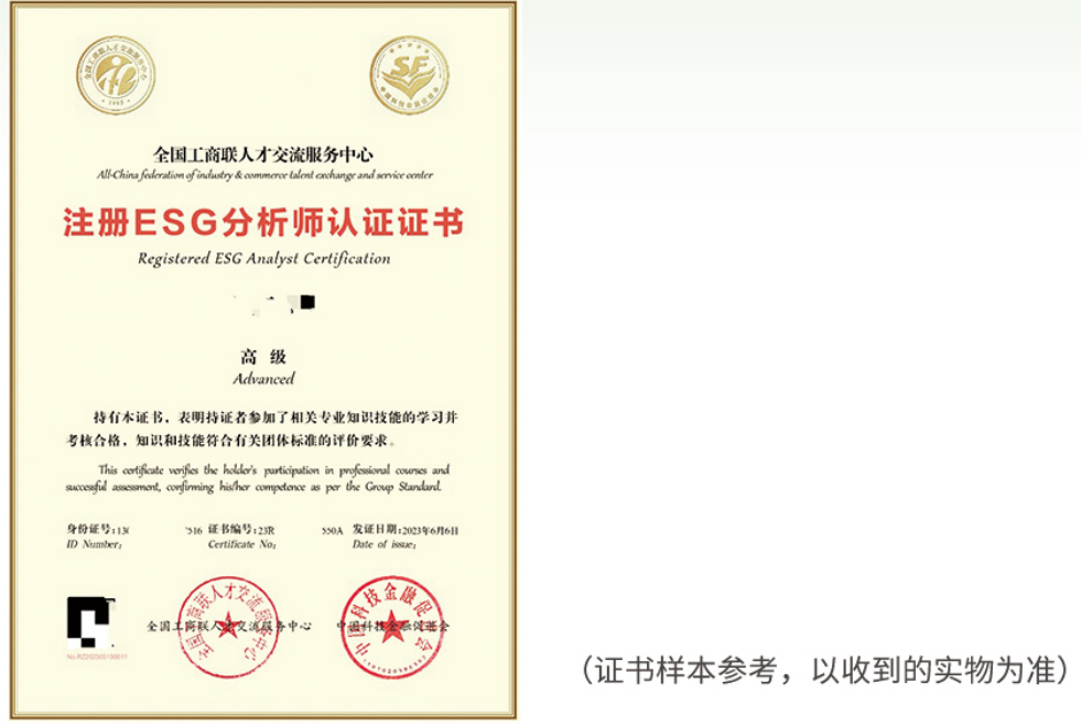 考试成绩合格后获得《注册ESG分析师》认证证书,该证书终生有效。
